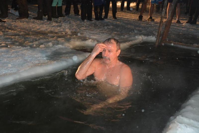 Конечно, волнение испытывают все, мужчины не исключение. В этом мужественно признаются Игорь Пузик и его друг Петр Геращенко. Впрочем, в отличие от девчат, у них все позади – от разгоряченных тел валит пар, и в эту минуту веришь им: искупаться на Крещение – это истинное удовольствие. Игорь испытал его еще четыре года назад, когда вместе с отцом первый раз нырнул в прорубь, Петр только что, поддавшись на уговоры друга. А вот Сергея Вельгерта пойти на столь экстремальный шаг не заставил даже пример супруги Натальи, целенаправленно двигавшейся в сторону проруби. Девушка в купальнике, правда, встала на защиту тепло одетого мужа, горячо убеждая – он болеет. Довод мужчины был куда убедительнее: